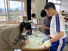 学校に戻ってからは、採取してきた土や泥を観察しました。双眼顕微鏡を用いて、火山灰に含まれる鉱物を見付けることができました。